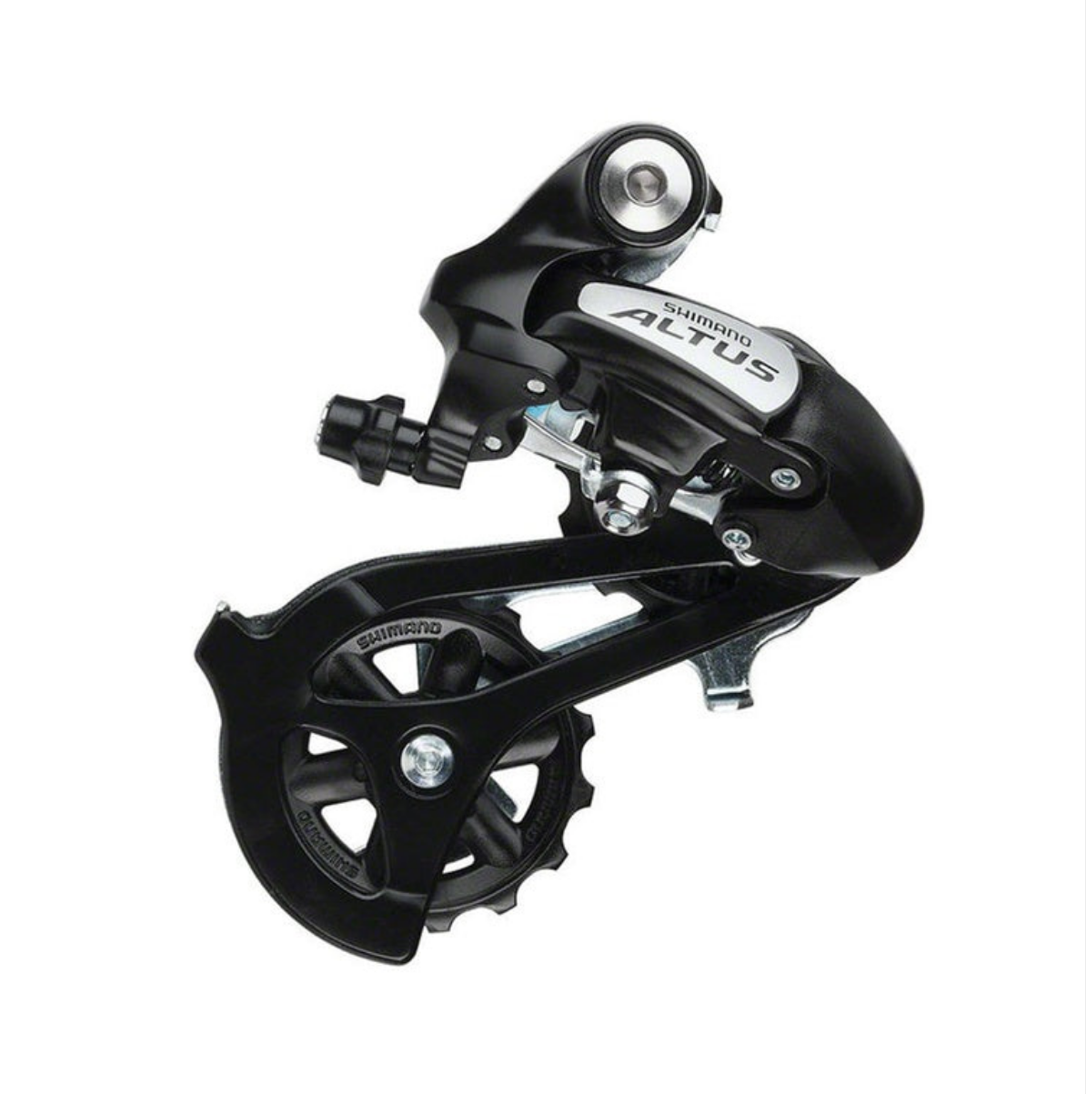 The Shimano Altus rear derailleur features an advanced light-action, long-cage design with Teflon-coated bushings. What sets the Shimano Altus derailleur apart from other rear derailleurs is its unique 13 tooth upper and 15 tooth lower pulleys that provide a 43 teeth chain wrap capacity (more than conventional 11 tooth pulleys) and enable them to rotate with less friction.